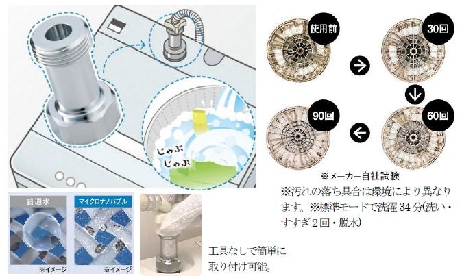 汚れを落とすマイクロナノバブル(通常の泡に比べて約20~2000分の1以下の非常に微細な気泡)が発生し、衣類の汚れ落ちがアップ。毎日の洗濯で洗濯槽にこびりついた黒い汚れまで徐々に落としてくれ、一石二鳥です。工具なしで簡単に取付け可能です。