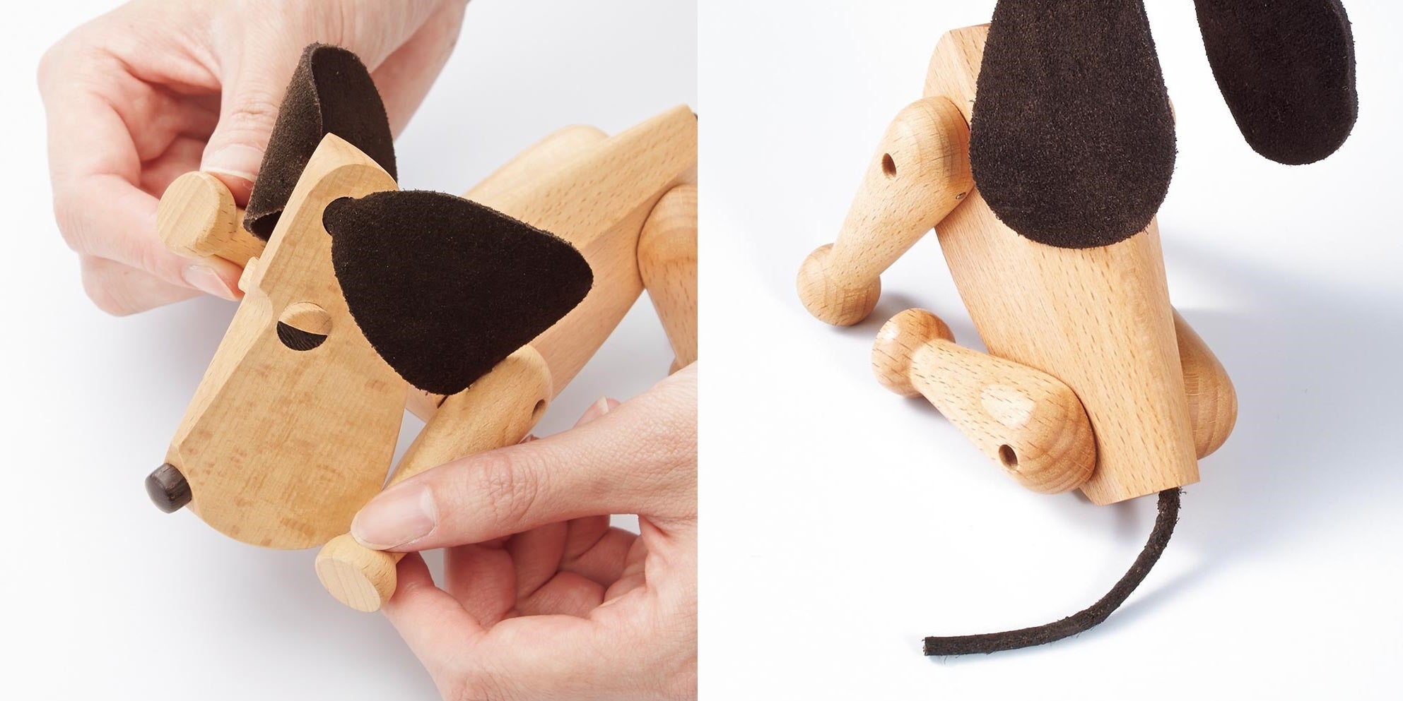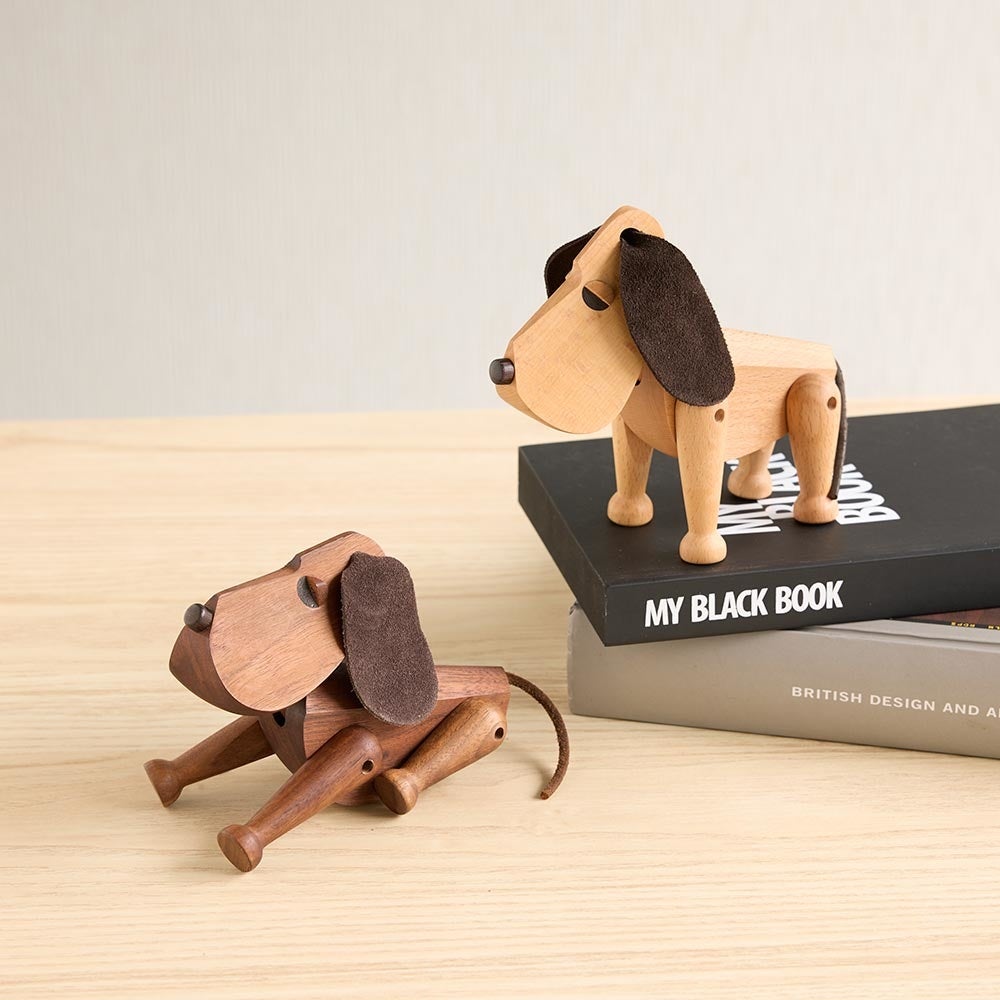 建築家のハンス・ボーリン氏がデザインした、犬のオスカーとボビー兄弟のオブジェです。胴体には天然木、耳やしっぽには牛革が使われていて、首や脚を動かして、お座りのポーズから、遊んでほしいとせがむ姿や歩き回る姿まで、まるで本物の犬のような動きを表現できます。見ているだけで心が和む、そんなオブジェです。
