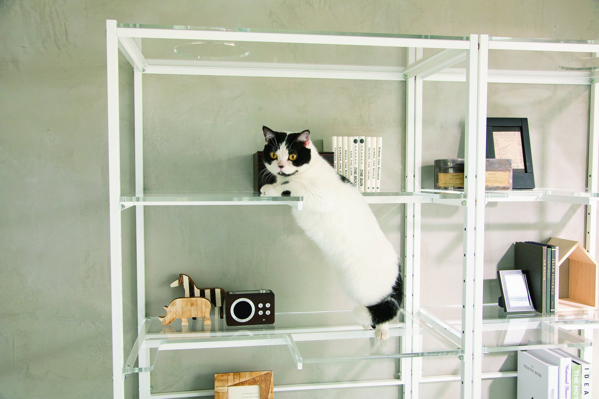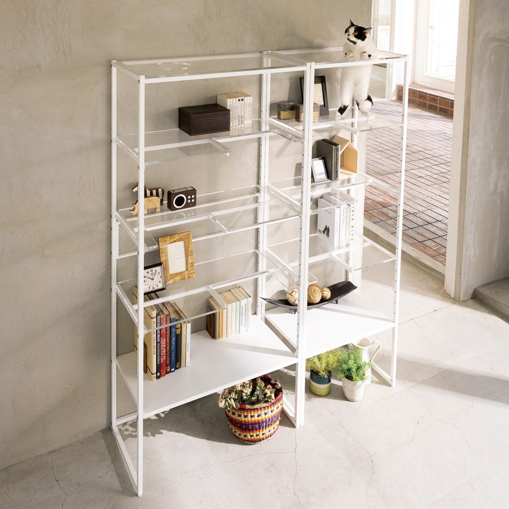 飾り棚としての収納力を保ちつつ、猫の導線もしっかり確保できるアクリルディスプレイラックです。本商品は購入して組み立てて部屋に置くだけで、SNSで話題の「#猫の裏側」を存分に楽しめます。ラック本体は、金物の町として有名な新潟燕三条の職人による丁寧なつくりで、デザイナーズ家具のように洗練された印象。大きめのものを収納しても猫が十分に通れる奥行設計の棚板は、6㎝間隔で高さ調節でき、最下段下の床にネコトイレやベッドを置けば、スペースを有効活用できます。