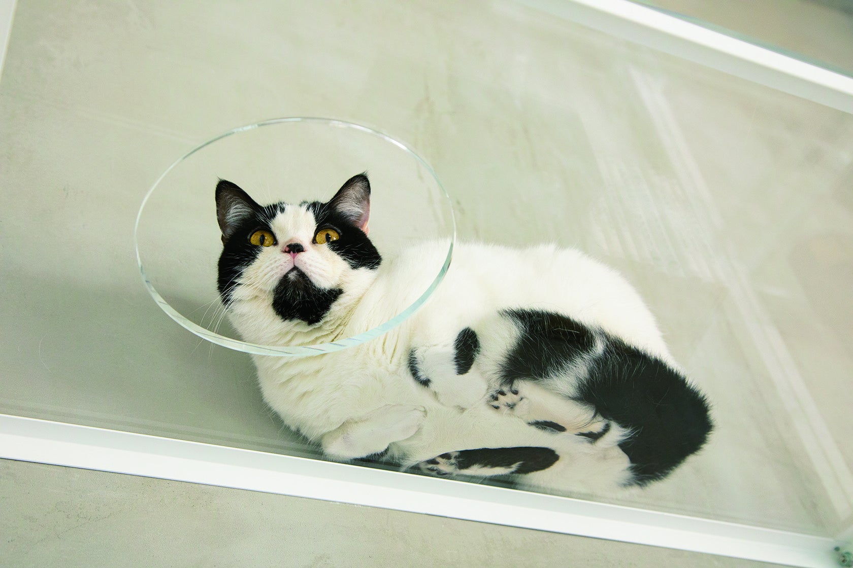 ▲アクリル棚の上で香箱座りをしている猫。折りたたまれた前足と肉球までしっかり見える!