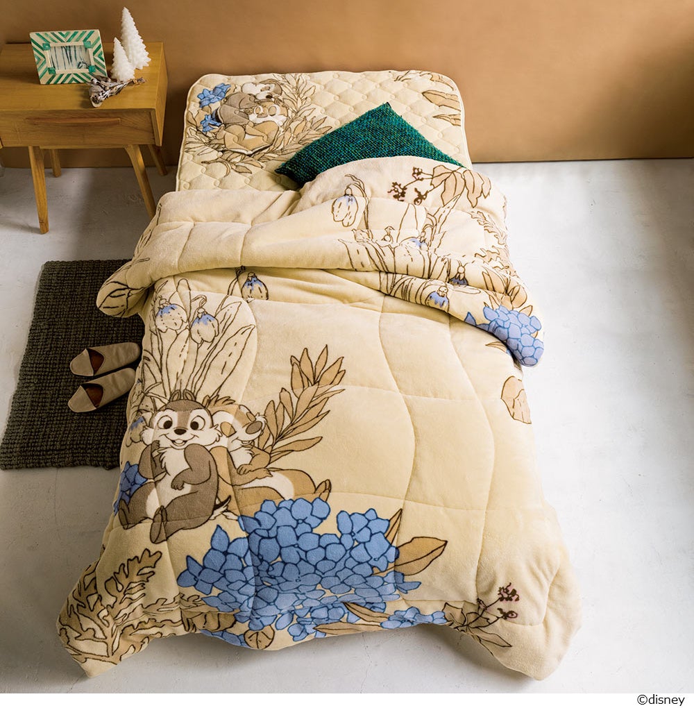 ナチュラルな花の中でくつろぐ「チップ&デール」は物語の中から抜け出したかのような世界観。敷きパッドは横になるとチップとデールが枕元に寄り添ってくれるようにデザインされています。温かみのある落ち着いた配色でインテリア性も高くおしゃれで、どなたにも取り入れやすいデザインです。