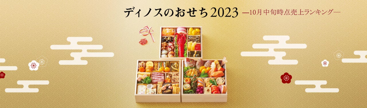 株式会社DINOS CORPORATION(本社:東京都中野区)は、ディノスオンラインショップ内に9月22日より「ディノスのおせち2023」サイト(https://www.dinos.co.jp/osechi_s/)をグランドオープンし、2023年のお正月に向けた各種おせちの予約販売を開始いたしました。ディノスのおせちカテゴリーでの前年同日累計売上金額対比約160%*1と好調に推移中。売れ筋傾向とともに2022年10月16日時点の累計売上ランキングを発表いたします。(*1_2021年9月24日~10月16日と2022年8月23日~10月16日比較)