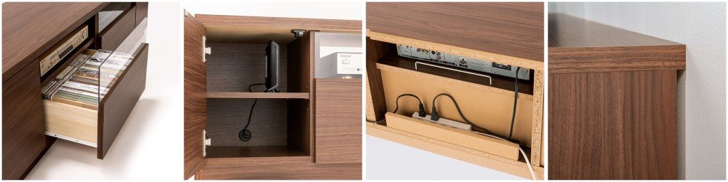 デッキ収納部の引き出しにはCDやDVD、ゲームのコントローラーなどが整理できます。左右扉収納部の背面にはコード穴付き。タブレットやゲーム機などを棚に置いたままで充電することも可能です。背面下部には電源タップ置き場もあり、配線がもたつかずすっきりします。天板が奥に1cm長い仕様なので、背面のすき間を活かしてコードが通しやすく、幅木よけになり壁にぴったり設置できます。