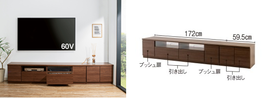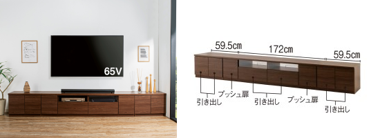 幅約172㎝・231.5㎝・261㎝・291㎝・320.5㎝・350㎝の6サイズとさらに幅サイズオーダーのキャビネットをラインアップしています。幅サイズをオーダーできるキャビネットで幅を調整することで、リビングの壁面に余分なすき間をつくることなく、壁いっぱいに設置でき、フルオーダーのような仕上がりとなります。