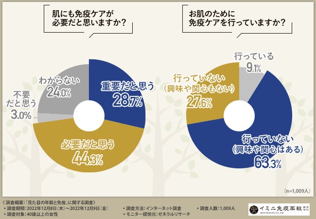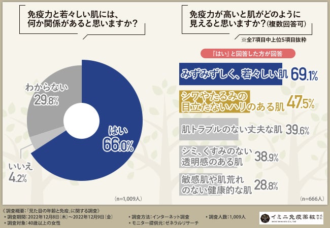 イミニ免疫薬粧株式会社(本社所在地:東京都中野区、代表取締役:泉 奈越子)は、40歳以上の女性を対象に、「見た目の年齢と免疫」に関する調査を実施しました。