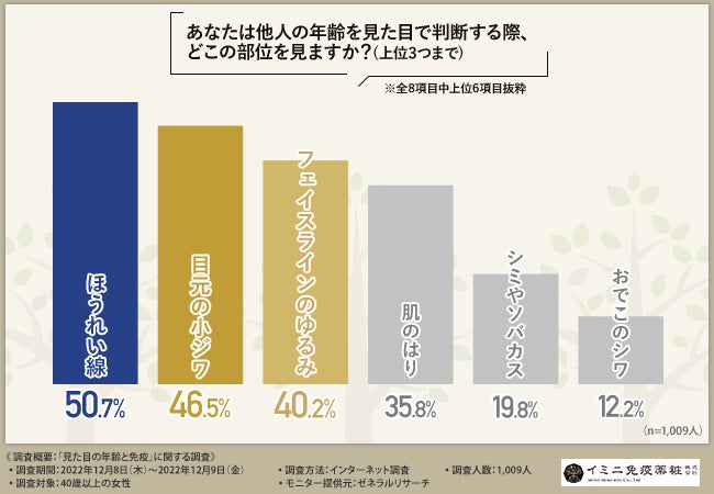「あなたは他人の年齢を見た目で判断する際、どこの部位を見ますか?(上位3つまで)」と質問したところ、『ほうれい線(50.7%)』と回答した方が最も多く、次いで『目元の小ジワ(46.5%)』『フェイスラインのゆるみ(40.2%)』『肌のはり(35.8%)』『シミやソバカス(19.8%)』『おでこのシワ(12.2%)』『肌のくすみ(8.1%)』と続きました。