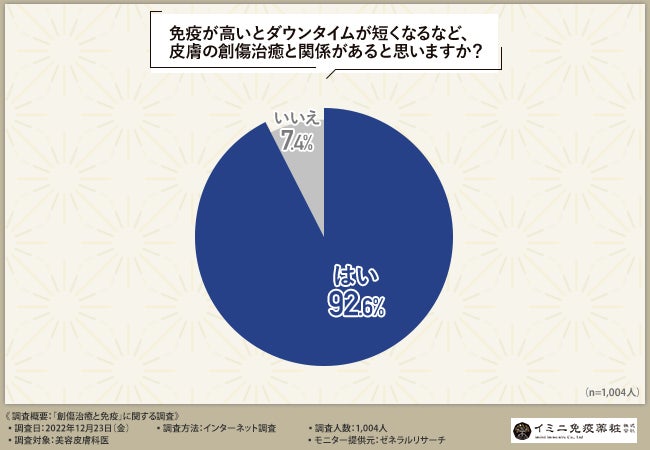 そこで、「免疫が高いとダウンタイムが短くなるなど、皮膚の創傷治癒と関係があると思いますか?」と質問したところ、9割以上の美容皮膚科医が『はい(92.6%)』と回答しました。