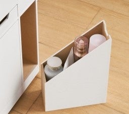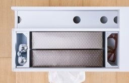 無駄のない縦型収納。天板フタをスライドして開けると、消費が早いティッシュボックスが2箱、ぴったり収まる想定の収納部となっています。ティッシュボックス収納部の左右には可動仕切り付き。美容グッズや筆記用具などが、出し入れ楽な「縦型収納」です。