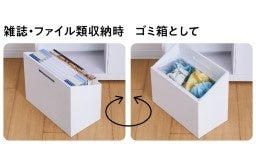 使い方が選べる2Way仕様のボックスです。ファイルボックスとしては、雑誌だけでなくA4のバインダーまでぴったり納まるサイズ設計。サイドが斜めにカッティングされているので、小さいサイズの書類も出し入れが楽です。ファイルボックスを裏返し、15~20Lのごみ袋をセットすればゴミ箱になります。ゴミ袋セット用の枠が付属しているので、袋が外にはみ出さずすっきりします。ワゴン本体にセットしたままゴミを捨てられるボックス形状です。ボックス収納部の奥には、ゴミ袋のストックを収納できるスペース付き。下部にスペースが空いているのでほこりの拭き掃除も楽にできます。