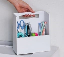 取り外して持ち運び出来る仕様。使う場所のそばに持っていけるよう取っ手の付いた取り外し可能な仕様です。仕切り板が付いているので、収納する量やモノのサイズに合わせて使いやすく収納できます。ワゴン本体に設置するときには筆記用具を見せることも、裏返して隠すこともできます。