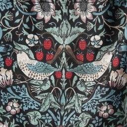 モリスのデザインの中でも、もっとも愛されているのが〈いちご泥棒〉です。<いちご泥棒>はウィリアム・モリスが1883年に描いたデザインとして知られ、庭先に植えられていたいちごの実をついばみに来たつぐみを描いています。ディノスでは<いちご泥棒>のテキスタイルを使用してお出かけアイテムを企画開発しました。
