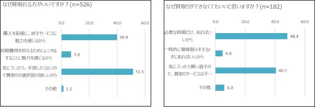 ほとんどの人がレンタル後、買取れる方がいいという結果に。買取れた方がいい理由としては「気に入ったら、手放したくないので買取の選択肢が欲しいから」が51.5%、フリーアンサーでは「気に入ったなら返品するのが面倒と感じると思う」という声がある一方、「想い出が染み込むから」という声もありました。