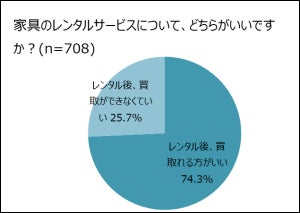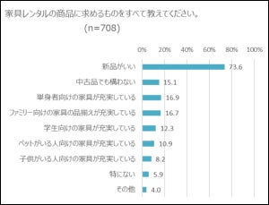 家具レンタルの商品に求めるものは「新品がいい」が73.6%。気に入ったら、手放したくなくなるので買取の選択肢が欲しいという声が多くあることからも、新品が求められているようです。