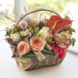 ワイルドフラワーのカラーリングからインスピレーションし、少し無骨さも感じつつ、 優しいウォームカラーにアンスリュームのレッドが際立つバスケットアレンジに。花や葉やリボンなど、それぞれの質感の魅力も感じられるよう生けています。