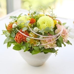 黄色オレンジ系で元気が湧いてくるカラー。ニュアンス系のカーネーションやアンティーク系の器で、自分にも人にもやさしくなれるそんなアレンジを目指しました。リビングに置いていただくとお部屋も明るくなり会話が弾むかも?!お見舞いやお悔やみなど様々な用途でお使いください。