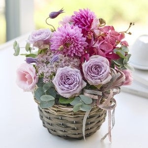 バラをベースに、ダリア、モカラなど甘すぎないピンク系にアレンジし、人気の高い「シャビーシック」な雰囲気をバスケット、麻リボン、花色で表現しました。