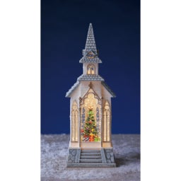 美しい教会の形のスノードーム。光満ちる教会の中に幻想的なシーンが広がります。スイッチを入れると暖かな光がともり、ツリーを中心に、ラメがキラキラと雪のように舞い躍ります。