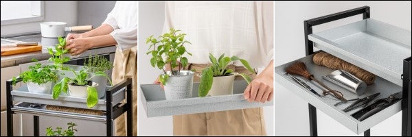 キャスター付きだから移動も楽々。キッチンで使用する際は、トレーをワゴンから外し、カウンターに置くこともできます。トレーと引き出しには、屋根や外壁によく使われるガルバリウム鋼板を使用。水に強く錆びにくい素材で、トレーは取り外し可能なため、洗えて清潔にご使用いただけます。土などの汚れがついてもサッとひと拭きすれば汚れが落ちます。メッキ塗装を施しているので、キッチン付近で使用する際に油がついても拭き取りができます。上段トレーのすぐ下には、引き出しが1杯付き。スコップやはさみなど、ガーデニングで使う道具をまとめて収納できるので普段は隠してしまえて、使いたい時にサッと取り出せます。