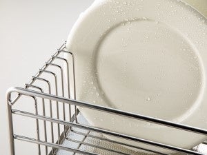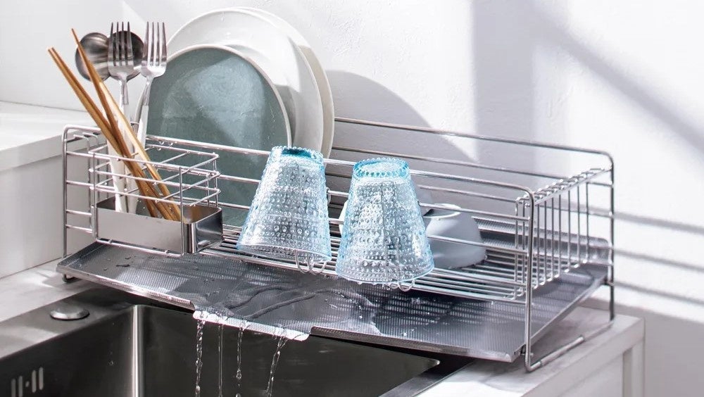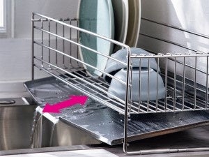 水受けトレー後方の折り返しを上向きに、かつ長くすることで水切りかごの後ろ部分への水漏れをガード。お皿を置く際に、後方に水が漏れにくく、水滴を拭き取る頻度も減りお掃除がラクです。また、両サイドのワイヤーがお皿などの食器を支える設計にし、水滴が付いた皿をしっかりホールドすることで、不快な水の飛び散りを防ぎます。