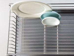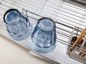 ツール類も収納できるよう、グラスホルダーと箸立てを付属。グラスホルダーは飲み口が広めのグラスを並べても干渉しにくい8.5cmピッチでゆとりを確保。箸立ては内部が3つに分かれているので、お箸やスプーン、フォークなどの小物類を分類して収納できます。グラスホルダーと箸立てを一緒にセットしても、シンク内にすっきり収まります。さらに、水切りかご本体のワイヤーピッチを約11.5・6.5・10cmと細かく設定することで、大皿から豆皿まで、お皿のサイズに合わせて効率よく立てられ、しっかり水を切ることができます。