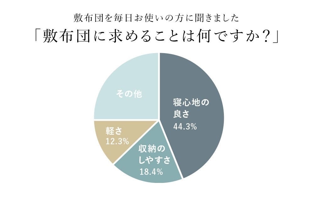 敷布団を使用している人を対象にアンケートを実施。「敷布団に求めることは何ですか?」という質問に対し、結果は寝心地のの良さ44.3% 収納のしやすさ18.4% 軽さ12.3%でした。