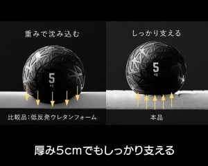 重さ5kgのボールを同じ力で転がすと低反発ウレタンフォームの方はだんだん重さを吸収しウレタンに沈み込むようにして止まりますが、本品は適度な反発力があるため止まらず転がります。だから寝返りも軽い力でスムーズに行うことができます。