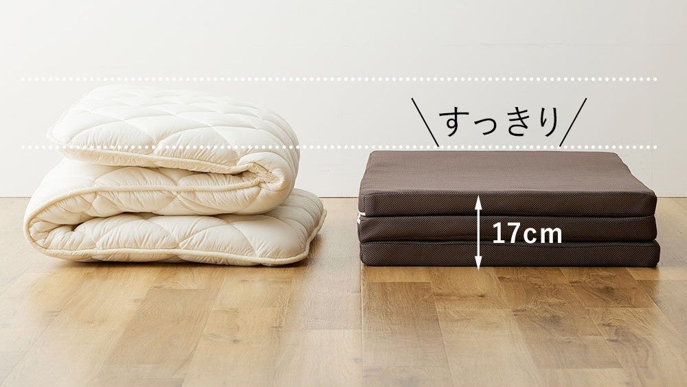 <省スペース>3つ折りで畳んで厚み17cmととっても薄いので収納も省スペース。