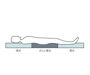 中素材の中央部は頭・脚部分よりも固めにし、沈み込みやすい腰をしっかり支えるバランス設計に。2種類の硬さで腰を沈み込みにくくし、身体に負担の少ないまっすぐな寝姿勢に導きます。