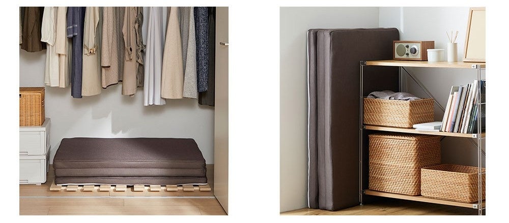 中わた入りの敷布団と比較するとコンパクト(写真右)。1人暮らしの収納でもスペースを取らず、また家族分を重ねて収納してもかさばりません。クローゼットや隙間にも省スペースで収納が可能です。