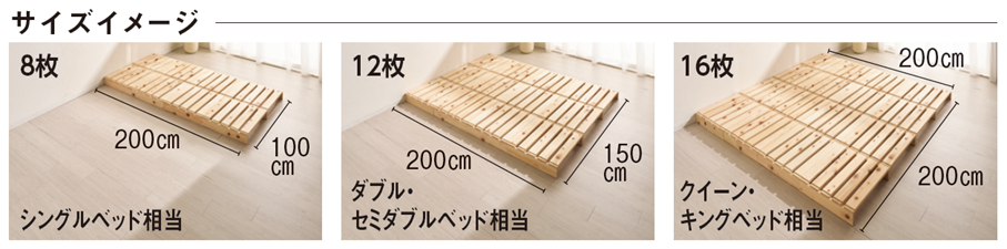 1枚あたり縦横幅50cm・高さ10cmのパレットを並べて設置することで、空間やライフスタイルの変化に合わせた自由なカスタマイズが可能です。パレット8枚でシングルサイズ、12枚でダブル・セミダブルサイズ、16枚でクイーン・キングサイズ相当と、家族構成やライフスタイルの変化に合わせて柔軟にサイズを拡張・変更することができます。パレット同士は連結不要。置くだけの簡単設置で、組み立ての手間を省きました。組み立て作業が苦手な方でも安心して使用いただけます。