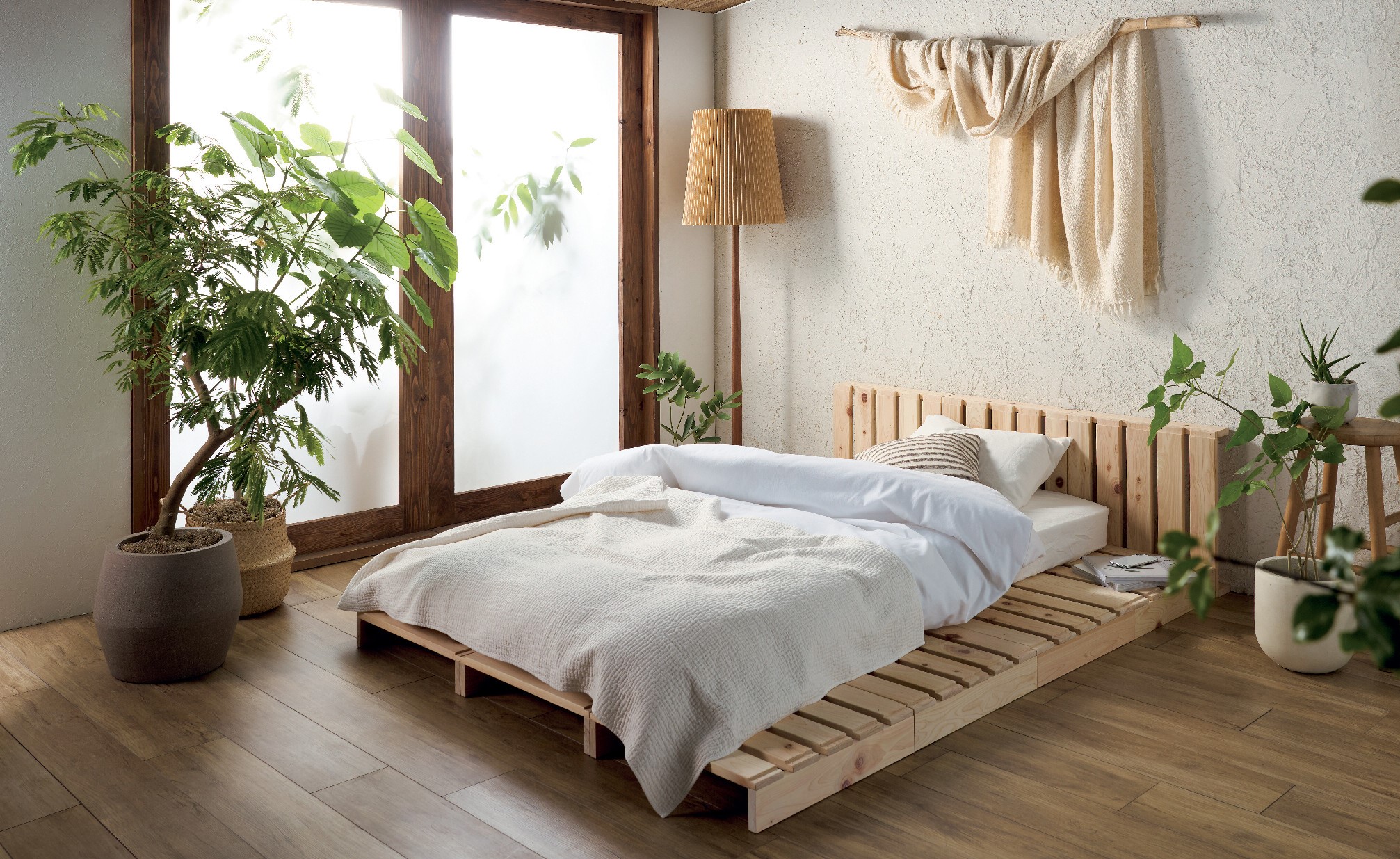 また、無垢材を無塗装で仕上げることにより、ひのきが持つ高い吸湿性を保持。パレットをすのこ形状にすることで通気性を確保し、高温多湿な気候においても快適な睡眠環境を保ちます。マットレスはもちろん、敷布団も直接置いて使用できます。