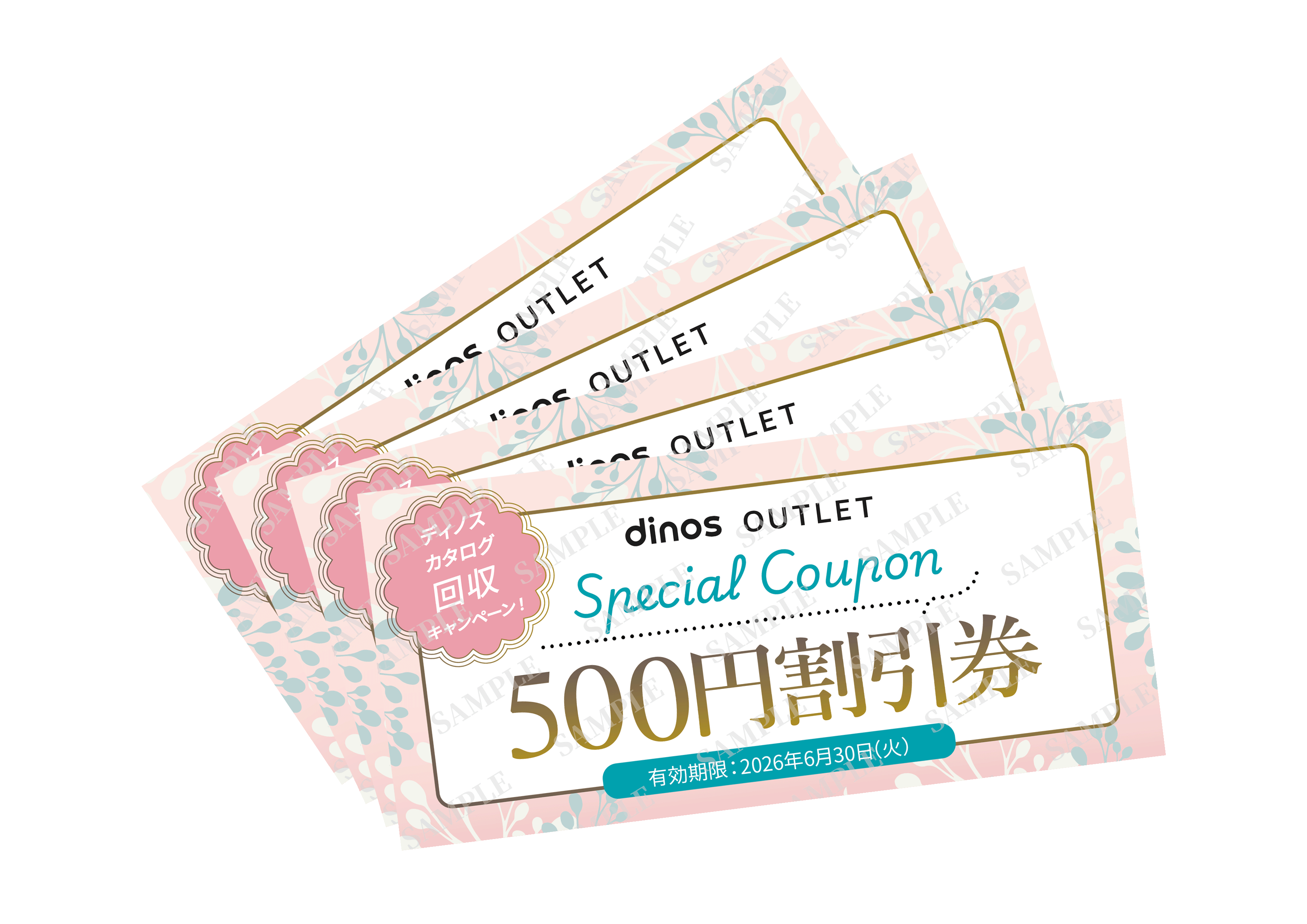 ディノスアウトレット店舗に不要となったディノスカタログをお持ちいただくと、5,000円(税込)以上の商品ご購入時に利用できる「500円(税込)割引クーポン」をプレゼント。2026年春は、持ち込み冊数に応じてクーポン枚数が増えるパワーアップキャンペーンとして実施します。