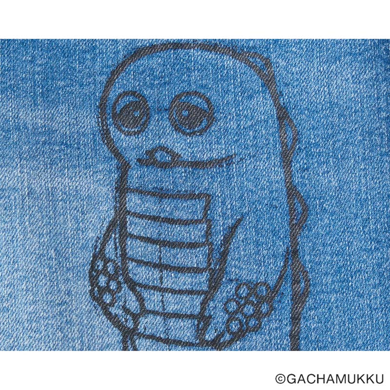 ガチャピン・ムックを黒の線画で描いたデニムアイテム