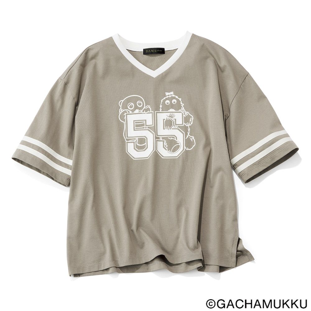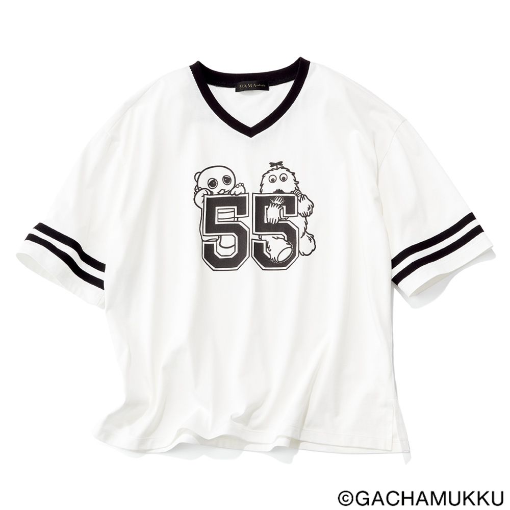 「ガチャピン・ムック ナンバーTシャツ」は、「55」ロゴとガチャピン・ムックをプリントしたアメフトTシャツです。「55」は今年で創業55周年を迎えるdinosと、永遠の5歳のガチャピン・ムックにちなんだ特別ナンバー。肩を落としたオーバーサイズに、浅めのVネック、肘まで届く袖には2本のラインを添え、ラフなデザインを大人に似合う表情に仕立てました。本商品を掲載したカタログ『DAMA collection +PLUS(ダーマ・コレクション+プリュス)』2026真夏号の5月26日(火)の発刊に先駆け、『ディノス オンラインショップ』で3月より先行販売いたします。