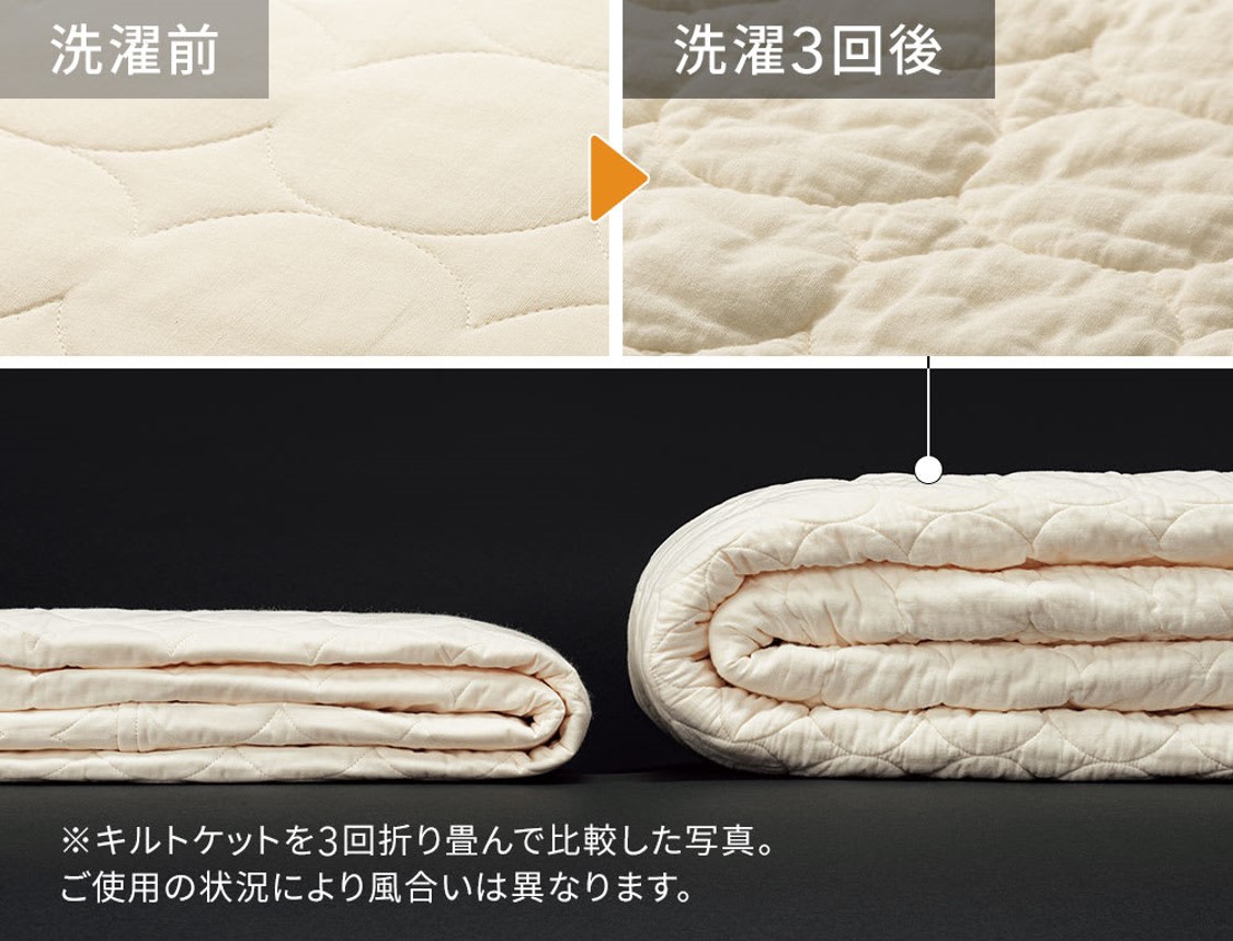 また、洗えば洗うほどやわらかく、とろけるような風合いに育つのも特徴のひとつ。使って洗濯するほど中綿がほぐれてふくらみます。洗濯機で丸洗い可能ですぐに乾くため、汗をかく季節はもちろん、洗濯が億劫になる梅雨時や真冬でも気軽に洗え、1年中気持ちよくお使いいただけます。中綿を増量した「パシーマ®EX」は、dinosが製造元・龍宮株式会社と開発したオリジナルモデルです。